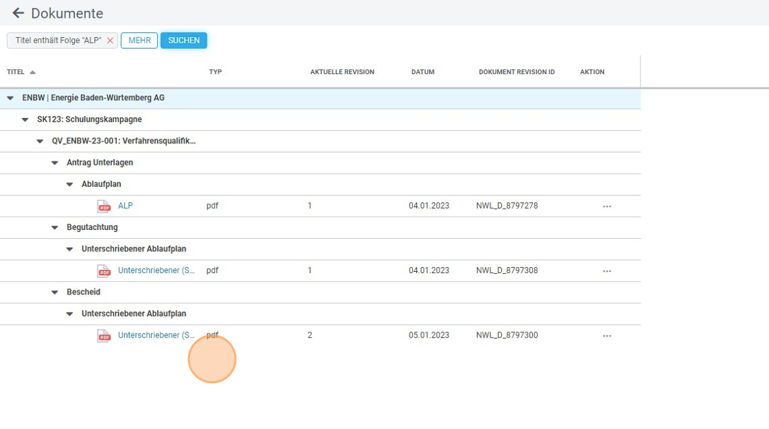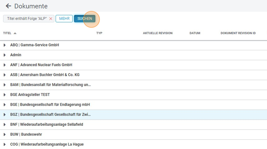 Tip: Sie können sowohl nach Dokumenten, als auch nach Informationen der Zweigung (z.B. Titel des Qualifizierten Verfahrens) suchen