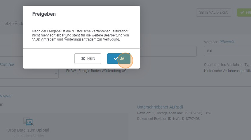 13. Klicken Sie auf "JA". Damit wird das historische Qualifizierte Verfahren für alle Beteiligten im Rahmen der Endlagerkampagne sichtbar.